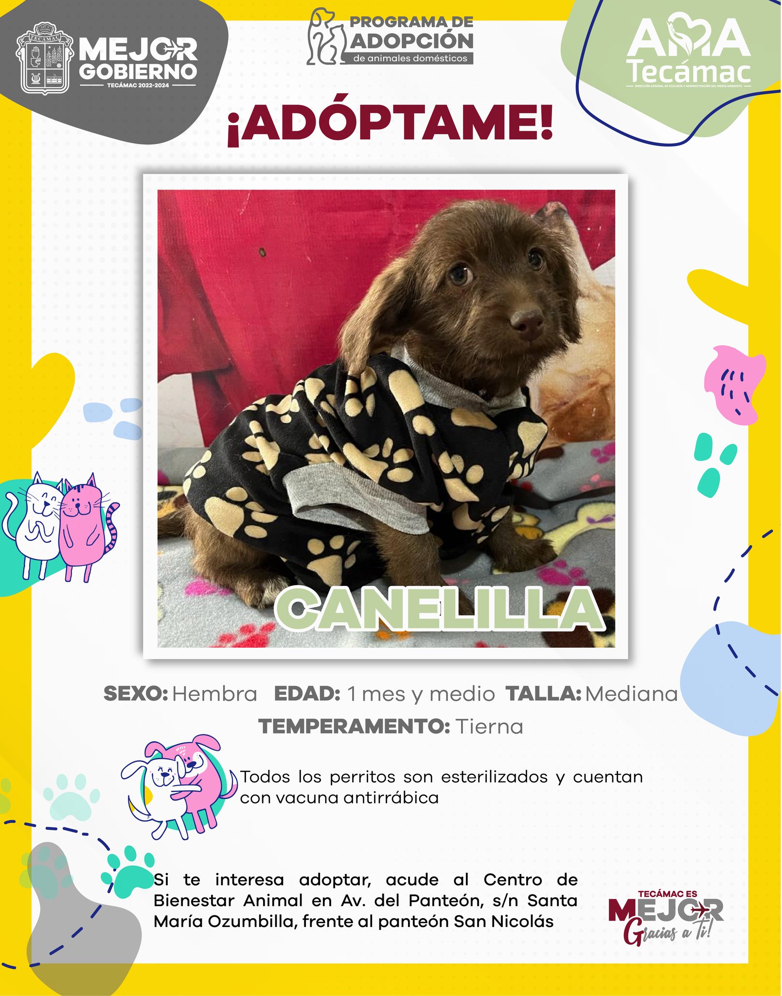 ¿Cómo Adoptar? Los interesados en brindar un hogar a estos simpáticos compañeros peludos pueden acercarse al Centro de Bienestar Animal de Tecámac. La ubicación exacta se encuentra en el siguiente enlace: Centro de Bienestar Animal en Google Maps.