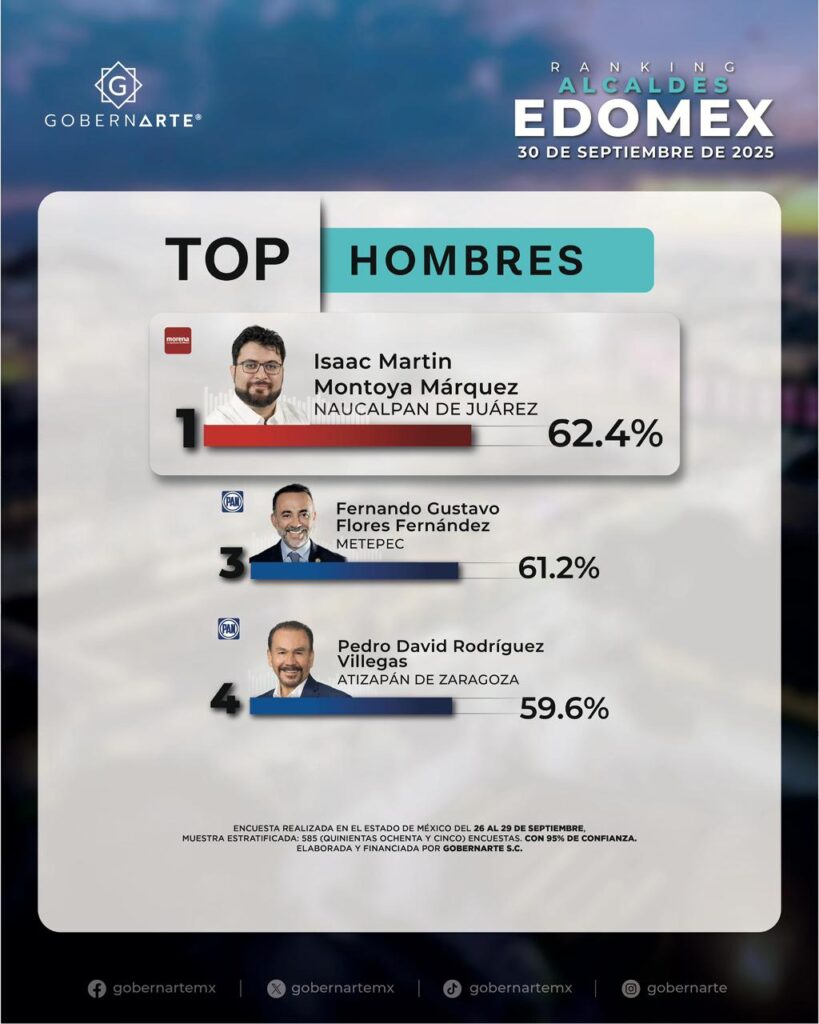 Naucalpan de Juárez, Méx.- El reciente ranking de alcaldes del Estado de México, realizado por la casa encuestadora GobernArte, ubicó al presidente municipal, Isaac Montoya Márquez en el primer lugar con un 62.4% de aprobación gubernamental.