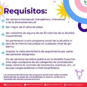 Las reglas de operación, publicadas en la Gaceta Oficial de la Ciudad de México, establecen que este programa otorga un apoyo económico anual de hasta 15 mil pesos y atención en materia de salud a personas transexuales, transgénero, intersexuales o de la diversidad sexual mayores de 21 años que viven en la Alcaldía Cuauhtémoc y se encuentran en situación de vulnerabilidad.